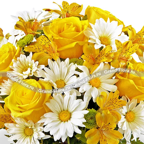 Люкс: роза желтая - 7 шт., хризантема белая кустовая - 3 шт., хризантема зеленая (сантини) - 3 шт., альстромерия желтая - 4 шт., папоротник - 3 шт., упаковка. Примерный размер: 30Х30 см.