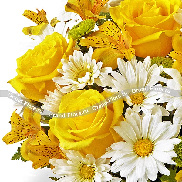 ДЕЛЮКС: роза желтая - 9 шт., хризантема белая кустовая - 5 шт., хризантема зеленая (сантини) - 4 шт., альстромерия желтая - 5 шт., папоротник - 4 шт., упаковка. Примерный размер: 40Х40 см.