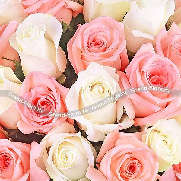 Букет белых роз и розовых роз (акционный букет, высота роз 40-50 см) Роза белая, роза розовая - 51 шт., упаковка, лента.